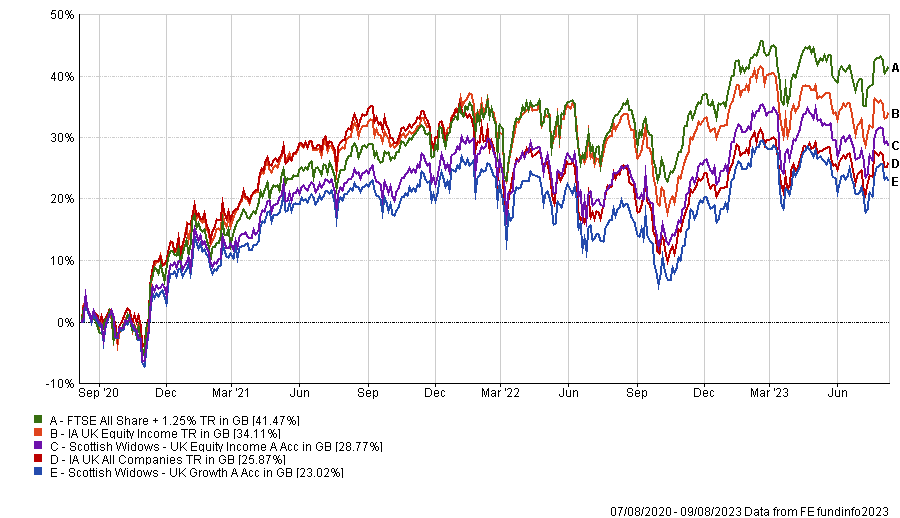 Performance of funds over 3yrs against sectors and benchmarks
