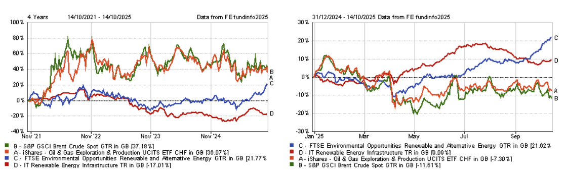 The IT Renewable Energy Infrastructure and the FTSE Environmental Opportunities Renewable and Alternative Energy index, for example, surpassed Brent Crude and oil and gas investments this year, closing a gap that at times was wider than 50 basis points, as the charts below show.
