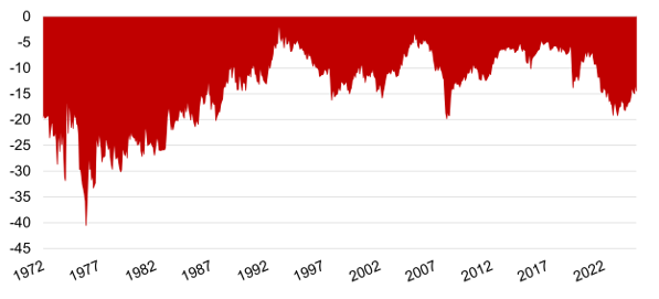 The data begins on 29 December 1972 and tracks unweighted average discounts across the investment trust universe, excluding venture capital trusts (VCTs). On this basis, discounts have spent prolonged stretches in double-digit territory. The longest ran from December 1972 to June 1989, lasting 16 years and six months. A second extended period occurred between June 1997 and January 2001, spanning three years and seven months. The current phase, which began in May 2022, has so far lasted three years and seven months to December 2025.