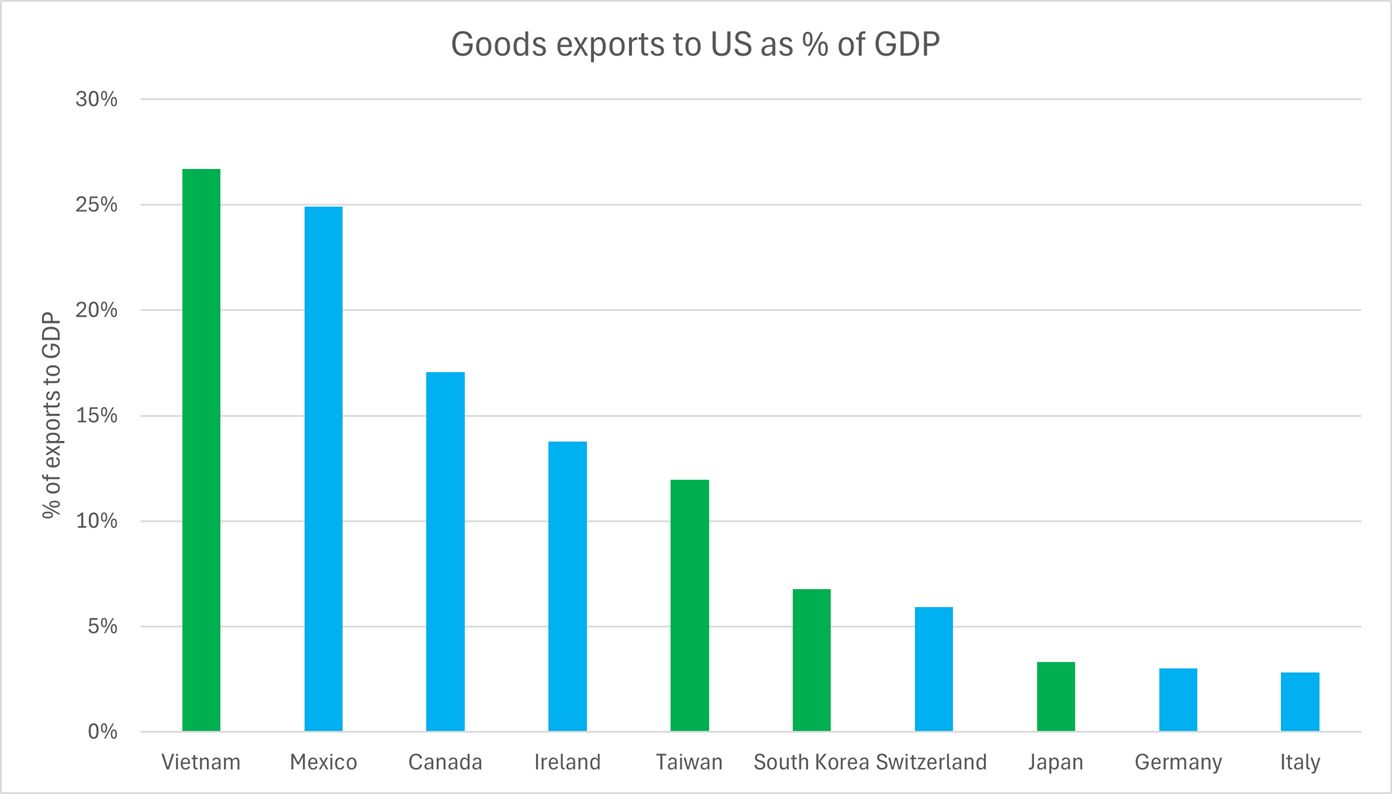In turn, that means a narrow US-centric lens risks overstating Asia’s vulnerability. Only four of the top 10 goods exporters to the US (measured as a percentage of GDP) are based in Asia, with Mexico, Canada and Ireland having a larger exposure than Taiwan, South Korea and Japan.