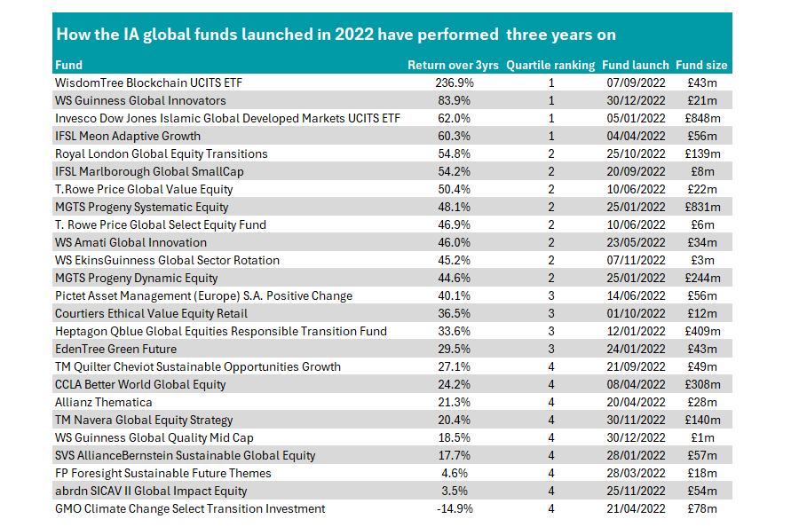 At the other end of the spectrum, there were several laggards on the list, with more than half of funds launched in 2022 failing to make above-average returns in their first three full calendar years.
