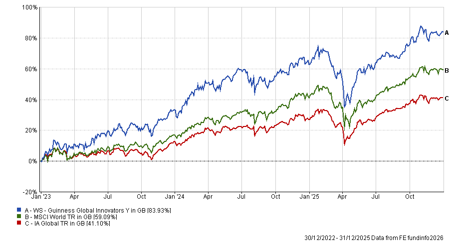 In a distant second place is the £19.7m WS Guinness Global Innovators fund, managed by Ian Mortimer and Matthew Page, who are also responsible for the firm’s income strategies. Its 83.9% return between 2023 and 2025 was the 15th-best return in the sector.