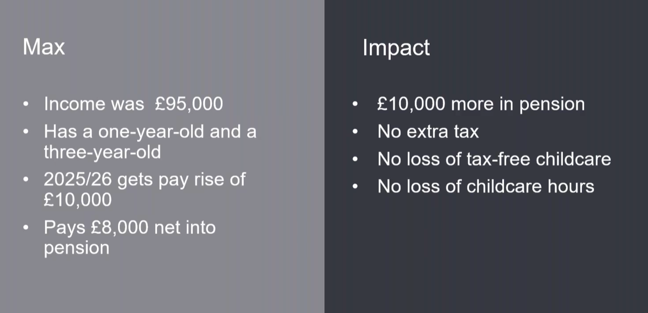 The solution, she argues, is a pension contribution. If Max pays £8,000 net into his pension, he receives £10,000 gross after basic rate relief at source. The additional 20% higher rate relief is reclaimed via his tax return, effectively cancelling out the extra tax he would have paid. More importantly, his net income drops back below £100,000, preserving both tax-free childcare and the funded childcare hours.