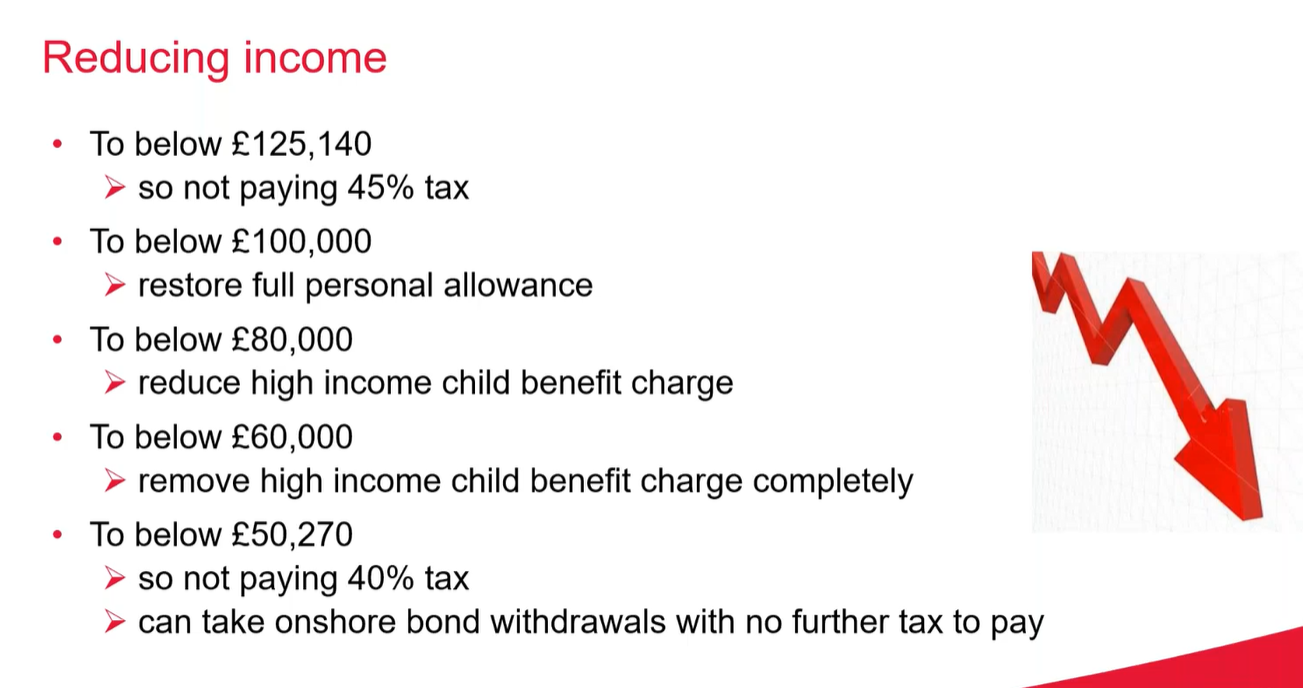 Dropping below £50,270 moves a taxpayer from the higher rate to the basic rate, restoring the £1,000 personal savings allowance. It also means onshore bond withdrawals are no longer subject to further tax, provided income remains below that threshold.