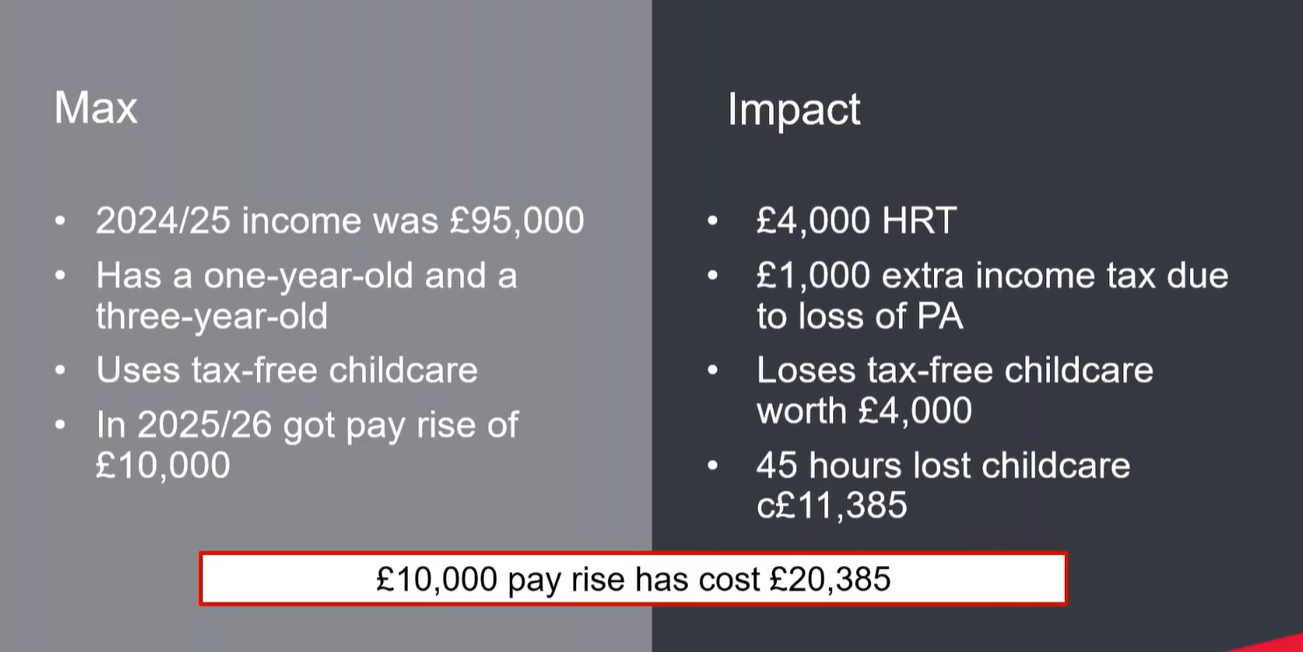 But the real damage comes from childcare. Crossing £100,000 means Max loses entitlement to tax-free childcare, which had been providing a £2,000 government top-up per child – a £4,000 loss.