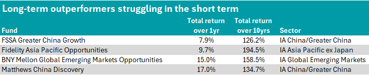 But even the long-term outperformers across the IA Global Emerging Markets, IA Asia Pacific ex Japan and IA China/Greater China sectors can experience a challenging year, whether due to cyclical positioning, market-specific headwinds or geographical weightings.