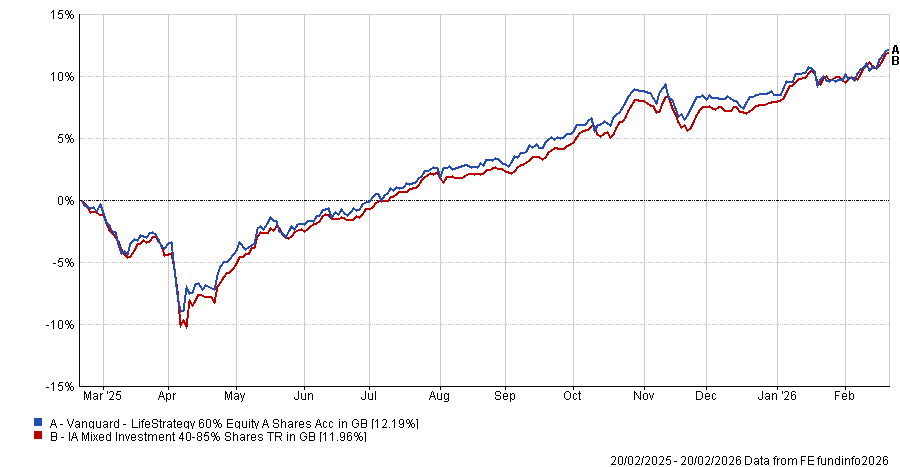 Vanguard LifeStrategy (example 60% Equity) £18.5bn IA Mixed Investment 40-85% Shares 39.3% 0.20% 65%