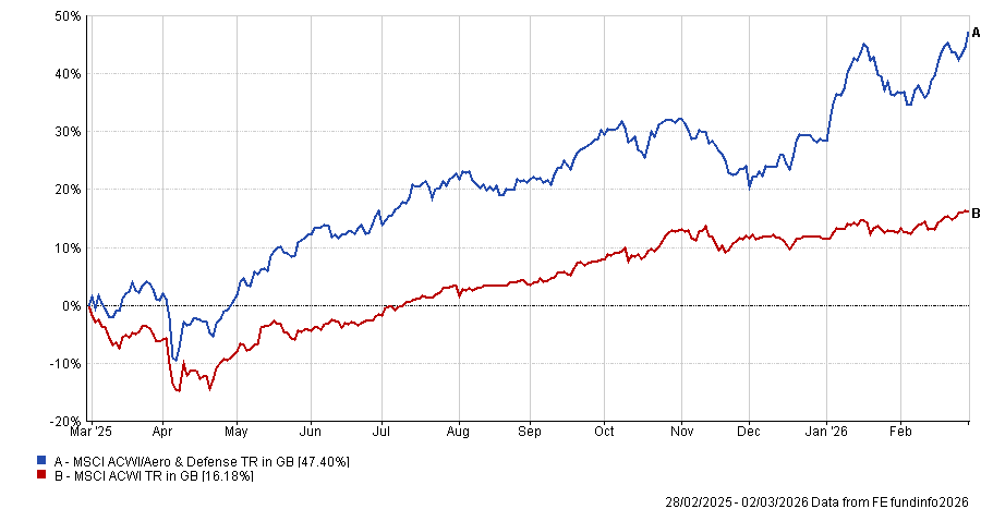 Performance of global aerospace and defence stocks vs global equities over 12 months