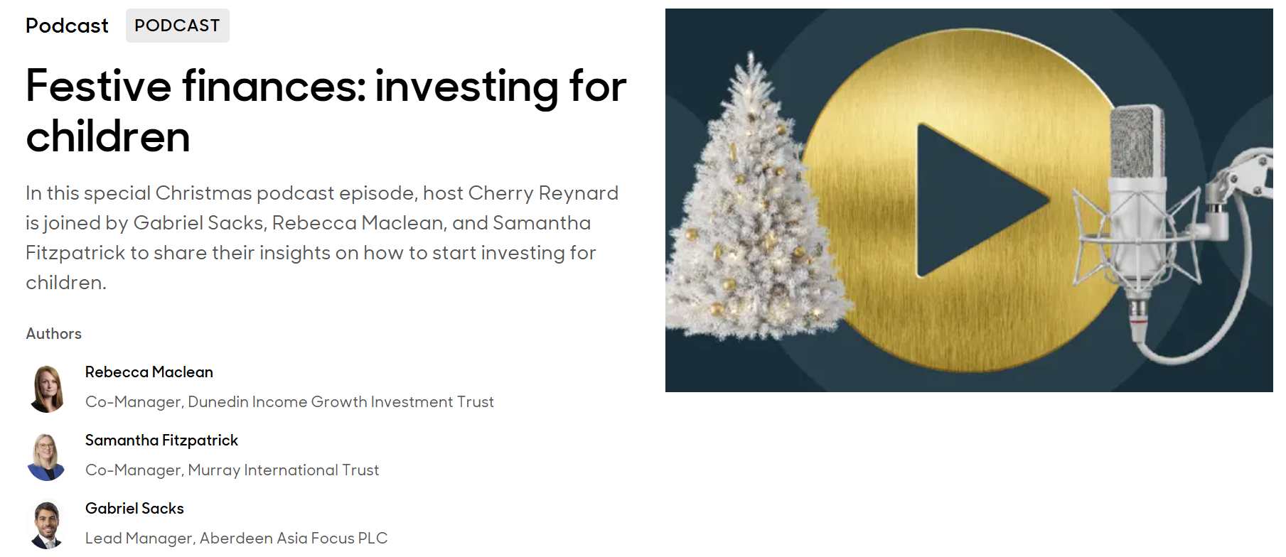 Tune into our special Christmas podcast episode, hosted by Cherry Reynard, featuring Gabriel Sacks, Lead Manager of Aberdeen Asia Focus, Rebecca Maclean, Co-Manager of Dunedin Income Growth Investment Trust, and Samantha Fitzpatrick, Co-Manager of Murray International.