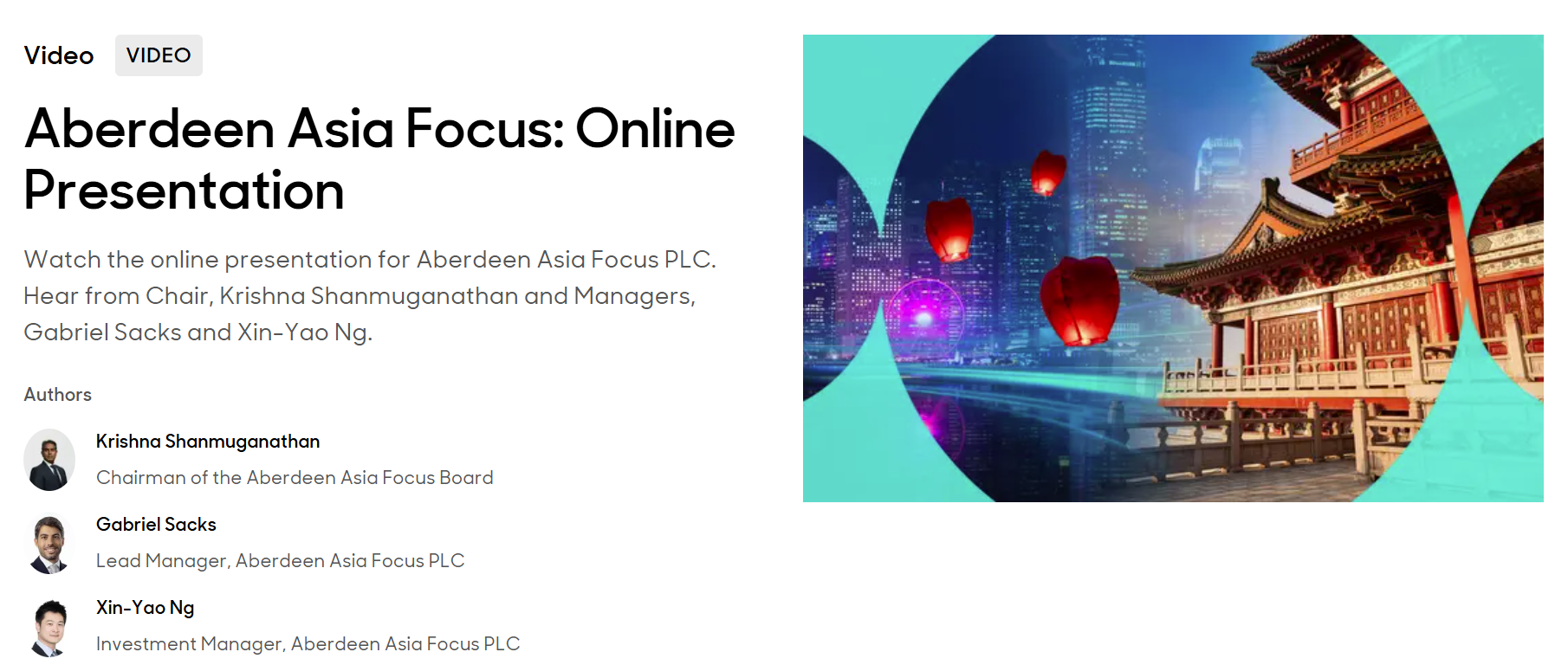 Watch the online presentation for Aberdeen Asia Focus PLC. Hear from Chair, Krishna Shanmuganathan and Managers, Gabriel Sacks and Xin-Yao Ng.