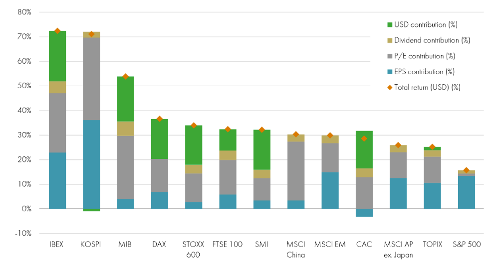 Emerging markets were a standout in 2025. Total returns of +34% were more than 16% ahead of the S&P 500, the strongest relative performance since 2009. A reversal in the fortunes of the US dollar – a considerable headwind for emerging markets over the past 15 years – offered support. Dollar weakness has given emerging markets’ central banks licence to cut interest rates across the board, supporting economies and markets alike. The strong overall performance was also driven by several idiosyncratic factors. For example, North Asian markets benefited from the global AI capex boom, with Korean equities also supported by the government's value-up program; the rally in precious metals was a key driver for South Africa; and Eastern European markets saw continued reforms as well as looser fiscal policy across the continent as governments boost defence spending.