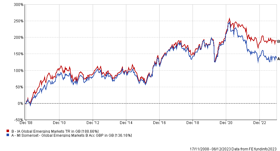 Co-founded by MP Jacob Rees-Mogg in 2007, Somerset is known for its emerging markets funds, the first of which, Somerset Global Emerging Markets, launched in 2008 and returned 136.2% since then, as shown in the chart below.