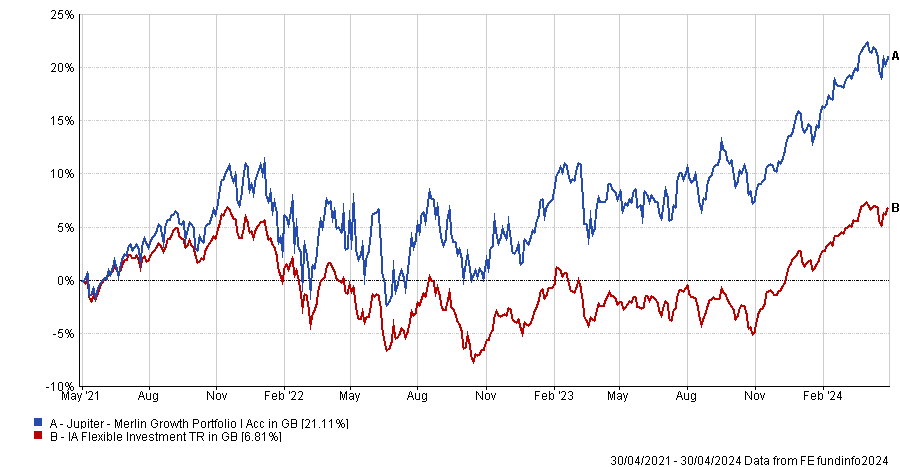 One of them is Jupiter Merlin Growth Portfolio, which is the only fund in the IA Flexible Investment sector that has matched our criteria. Chatfeild-Roberts was appointed manager of this fund in April 1997.