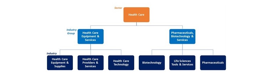 According to the GICS framework, the healthcare sector can be broken down into two industry groups, with six industries beneath this, as the below chart shows.