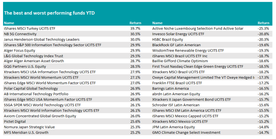 As such, eight of the top 20 funds over the past six months had a technology focus, with the likes of Janus Henderson Global Technology Leaders, iShares S&P 500 Information Technology Sector UCITS ETF and L&G Global Technology Index Trust among the top 10 funds so far in 2024.