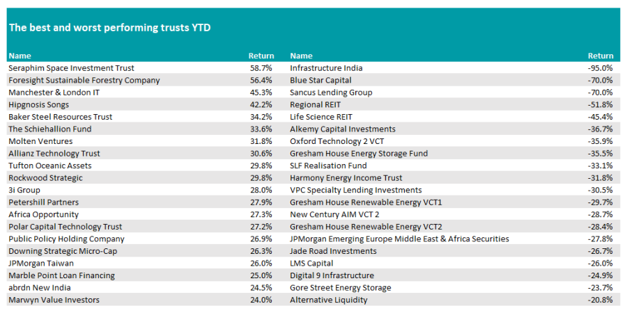 In terms of individual trusts, technology and UK smaller companies investment companies dominate the top 20, while on the downside, trusts investing in real estate and renewable energy have dropped off, as have a number of venture capital trusts.