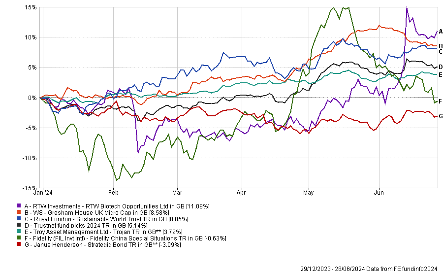 Heading further down the list, Trojan is in fourth place, selected by former Trustnet journalist Matthew Cook. The fund is designed to protect investors in times of market difficulty but is expected to lag when stocks fly higher, as they have done so far in 2024.