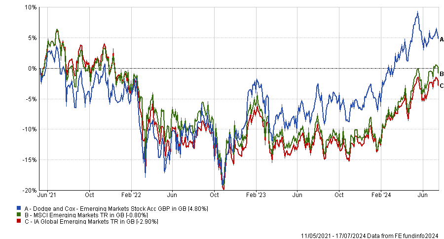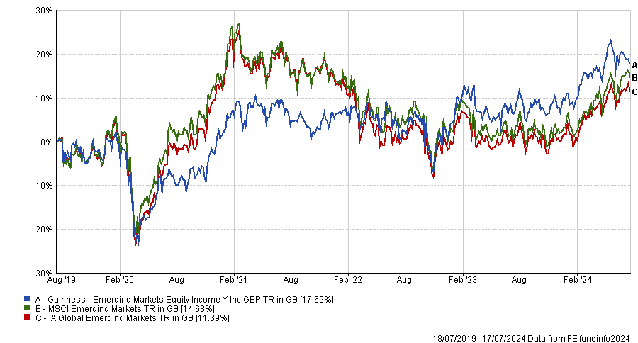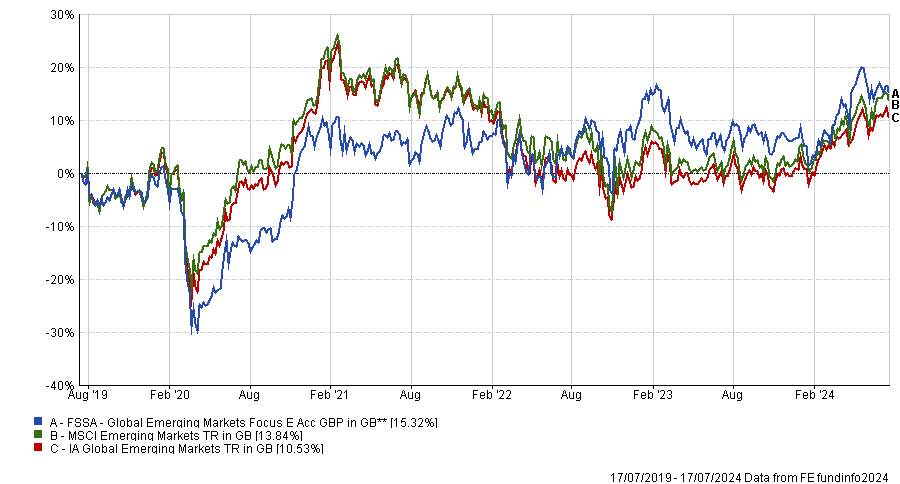 The fund sits in the second quartile of the IA Global Emerging Markets sector over five years and has been a top-quartile performer over three years.