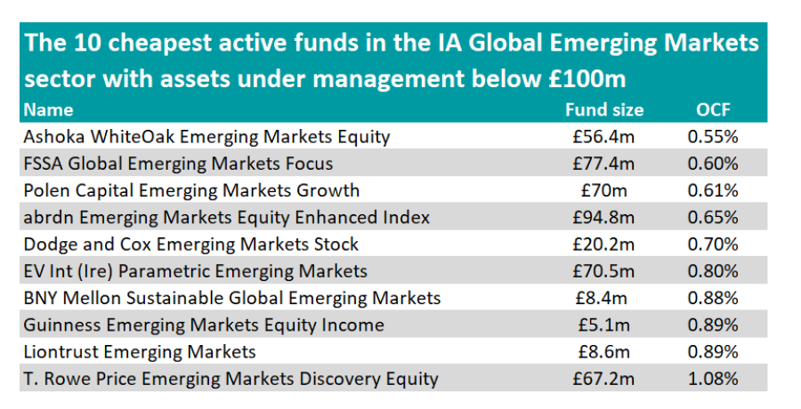 As such, Trustnet has found nine active funds in the IA Global Emerging Markets sector with less than £100m in assets and fees under 1%.
