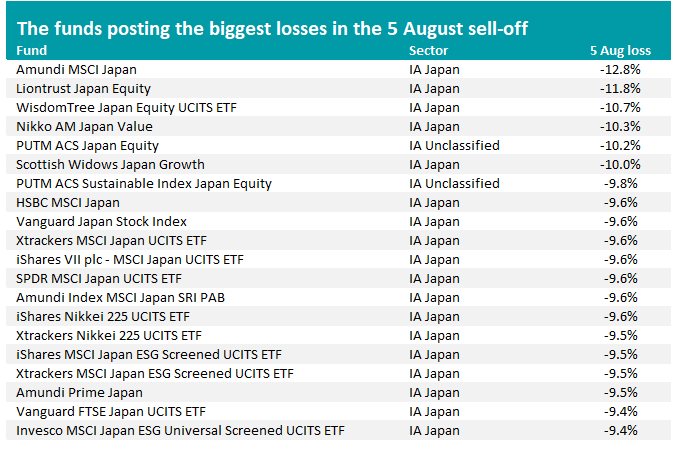 In all, 84.4% of the funds in the Investment Association universe made a loss on 5 August. There were 20 sectors were every fund made a loss, including IA Japan, IA UK All Companies, IA UK Equity Income, IA UK Smaller Companies, IA Technology & Technology Innovation, IA North America, IA North American Smaller Companies and IA Global.