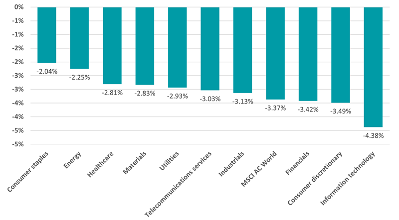 How did this play out among asset classes? Global equities were the focus of the selling with the MSCI AC World index dropping 3.4% over Monday’s session. With investors worried about the health of the economy, it was natural that they would pull back from risk assets.