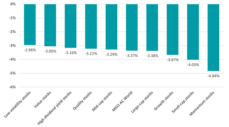 Momentum was the investment factor that sold off the most. Momentum investing has led the market for some time but investors have been drifting away from these stocks since early July; the style is known for staging dramatic reversals when strong runs come to an end.