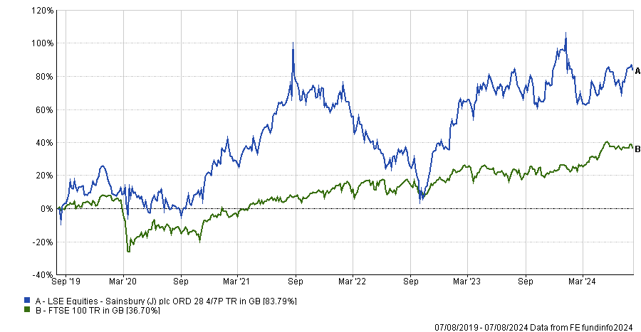Performance of Sainsbury’s over 5yrs vs FTSE 100