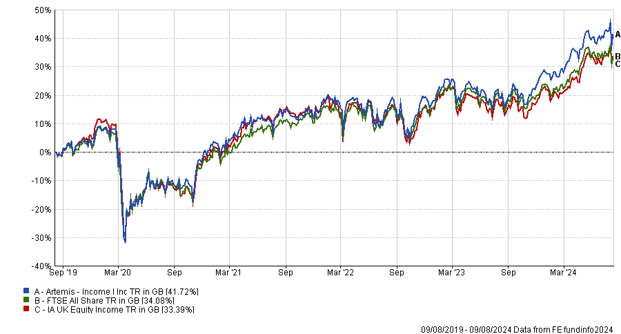 This £4.8bn strategy, led by FE fundinfo Alpha Manager Adrian Frost, is a “flexible, high conviction portfolio” of UK large-cap stocks selected for providing a steady and growing income along with capital growth over five years.