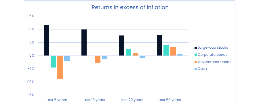Source: SJP. Stocks represented by Ibbotson SBBI US Large-Cap Stocks, Corporate Bonds by Ibbotson SBBI US Long-term (20-year) Corporate Bonds, Government bonds by Ibbotson SBBI US Long-term (20-year) Government Bonds, and Cash by Ibbotson SBBI US (30-day) Treasury Bills. Data - 31 May 1974 - 31 May 2024. Morningstar Direct, accessed via CFA institute