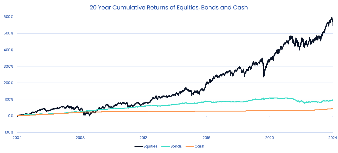 From 2004 to 2024, cash delivered cumulative returns of just 43%. By contrast, investment in global bonds delivered returns of nearly 96% while equities gained some 566%.
