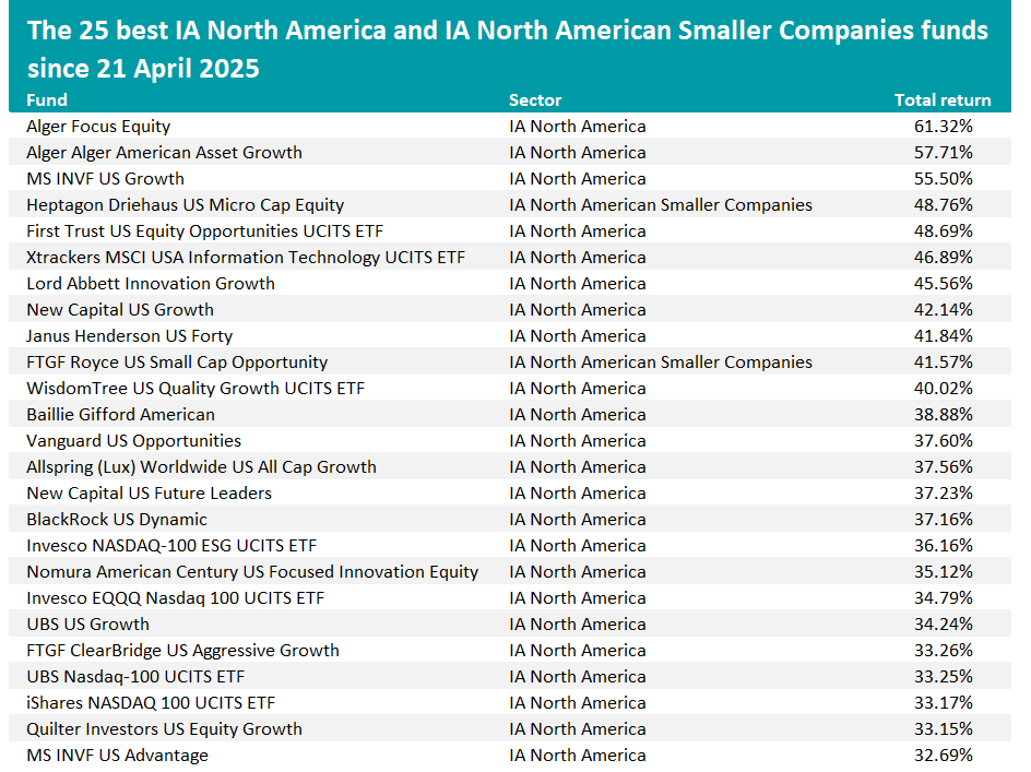 FE fundinfo data shows that two additional IA North America funds have achieved total returns of more than 50% over the past five months: MS INVF US Growth (up 55.5%) and Alger American Asset Growth (up 57.7%).