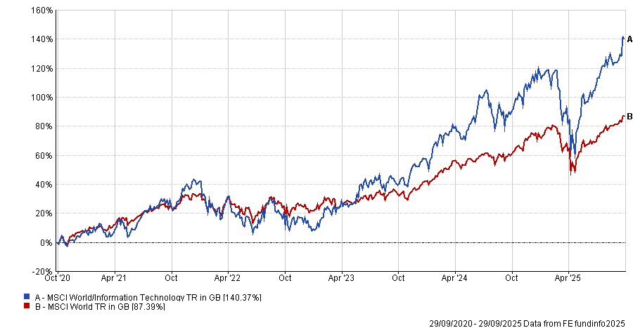 Technology stocks have delivered exceptional returns for years, with the MSCI World Information Technology index up 140.4% in the past half a decade, versus a 87.4% return from the MSCI World index.