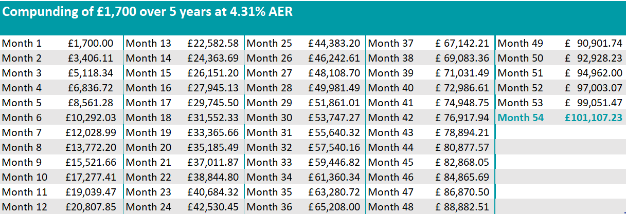 Using our example of being able to save £1,700 a month and assuming that the rate remains the same in the next five years (it won’t), you could reach the £100,000 goal in 54 months, rather than the full 60, as the chart below shows.
