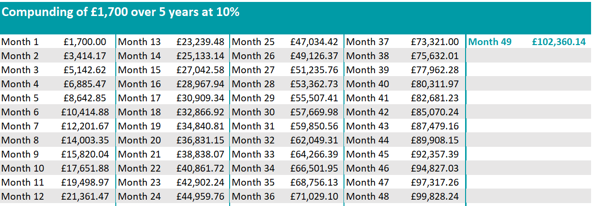 People have come to expect the stock market to deliver an average 10% a year, although that is not something that should be counted on. If that expectation is met, you could reach £100,000 from your £1,700 monthly investment a whole year earlier than expected, as the table below shows. It also helps those saving less each month to achieve the lofty £100,000 goal with lower payments.