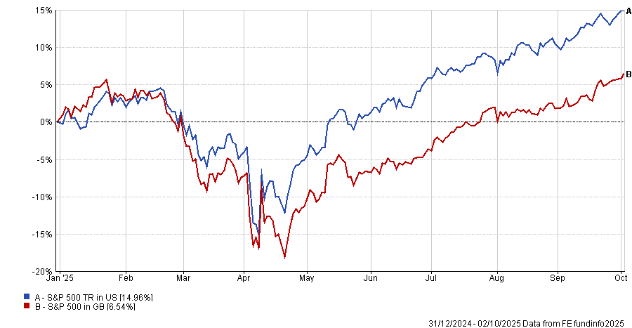 As shown in the graph below, although the S&P 500 (in dollar terms) has had a strong year-to-date, gaining just shy of 15%, UK investors have made around eight percentage points less in sterling terms.