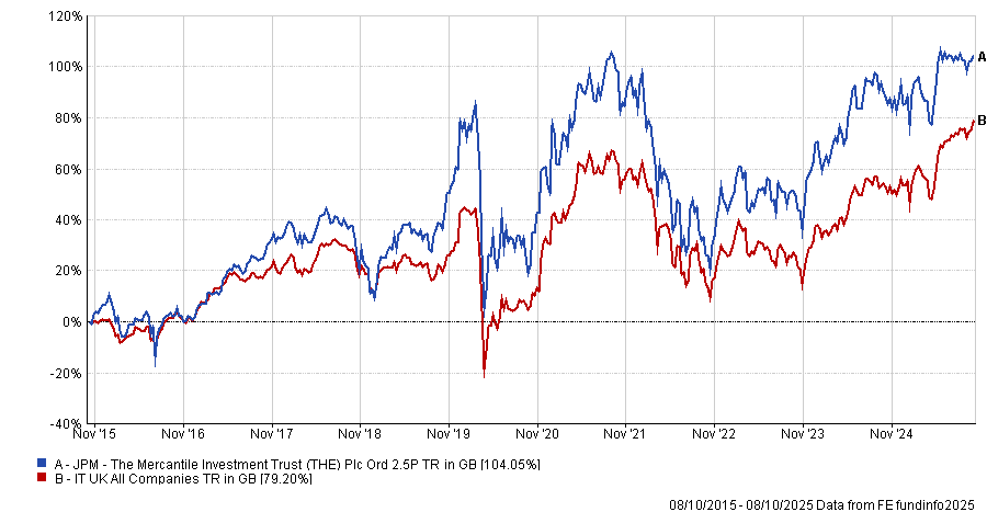 Mercantile has underperformed its peers in the IT UK Equity Income sector so far this year, but it has done much better in the longer term, with a 104.1% return over the past decade under Anderson’s tenure.