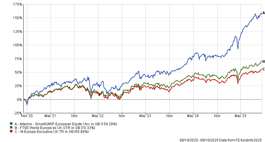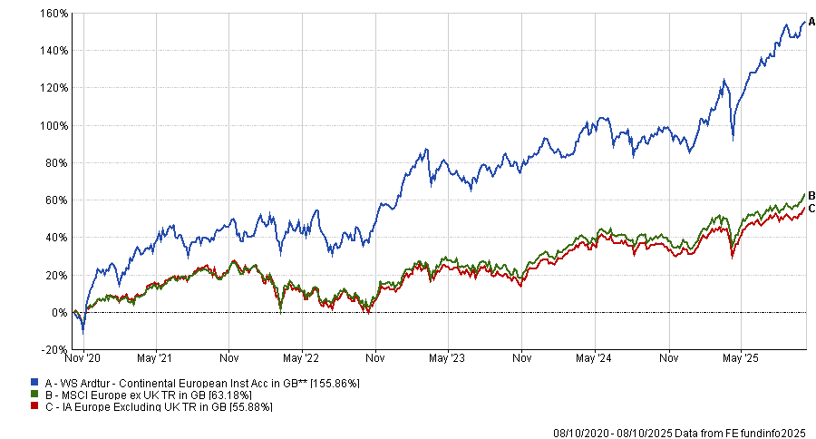 Managed by Oliver Kelton since 2015, the fund aims to outperform the MSCI Daily TR Net Europe Ex UK index over any five-year period. As of August 2025, the fund outperformed the index over one, three and five years.