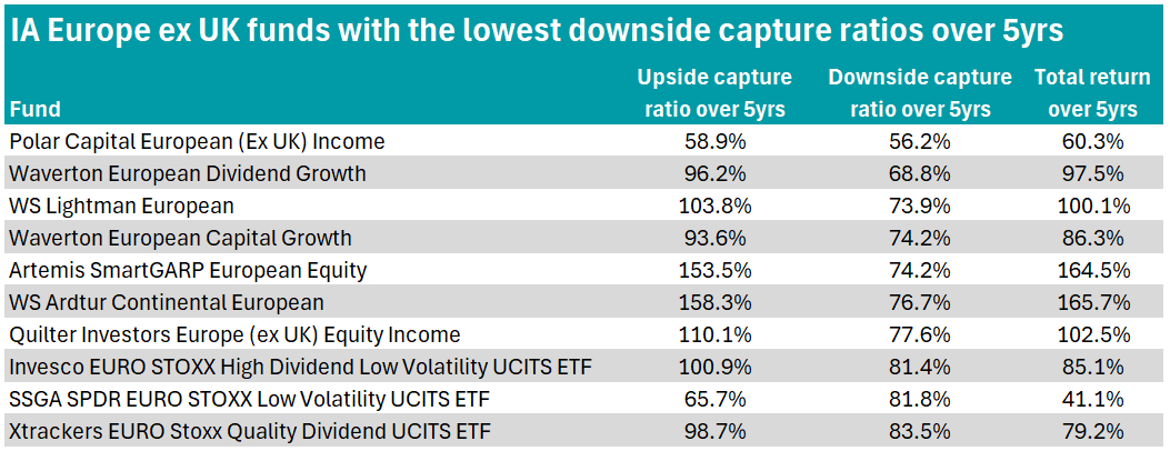 Polar Capital European (ex UK) Income offered investors the best protection when markets fell over the past five years, with a downside capture ratio of 56.2%.