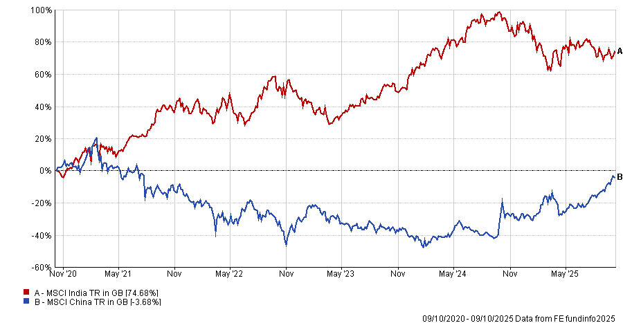 Both markets have had contrasting fortunes in recent years. While China has rocketed in 2025, up some 32.3% year-to-date, India has languished, losing investors 6% in sterling terms. However, India shone from 2021-2023 at a time when Chinese stocks fell sharply.