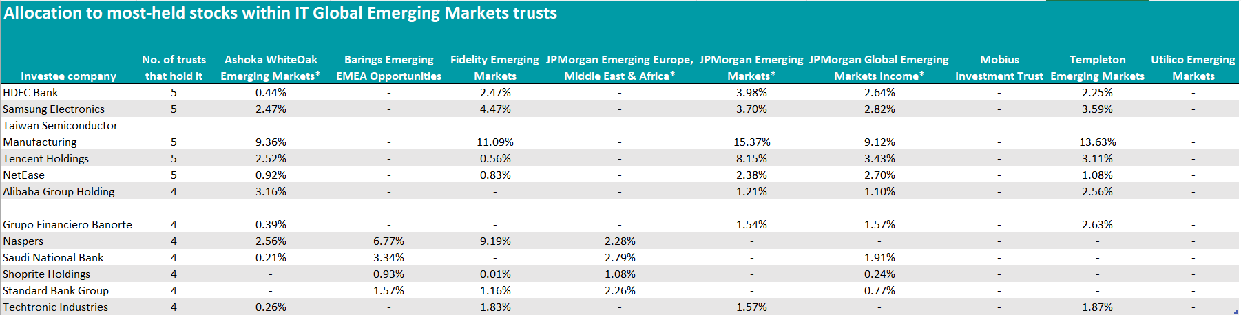 So I asked the research team at the Association of Investment Companies  (AIC) to pore through each of the ten investment trusts in the Global Emerging Markets sector to find out which stocks were the most commonly held in their portfolios.