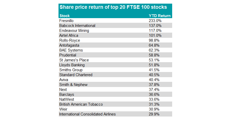 The market may be rallying, but it has been concentrated in a few key stocks in a handful of sectors, with the top five stocks gaining between 233% and 98.8% in share price terms, well beyond the 14% return of the FTSE 100.