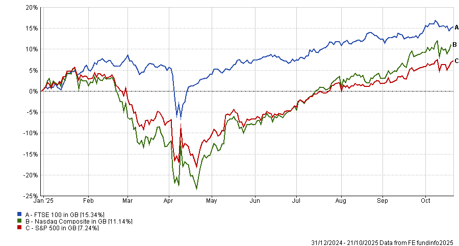 The FTSE 100 is up more than 15% in share price terms in 2025, outpacing the S&P 500 and Nasdaq Composite in sterling terms. Yates attributed this to investors trying to account for concentration risk in their portfolios and reduce their exposure to US tech.