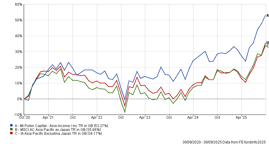 Third on the short list is the MI Polen Capital Asia Income fund. With just £20.5m of assets under management (AUM), it has posted a stellar five-year return of 53.3% in the IA Asia Pacific excluding Japan sector.