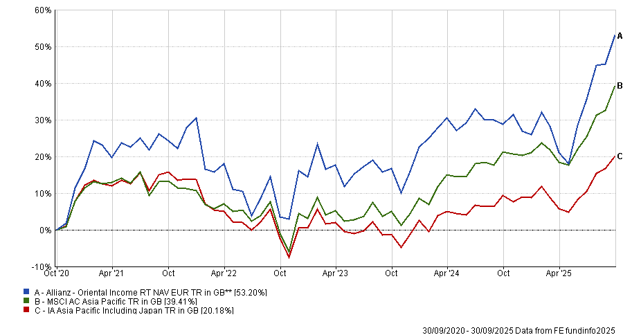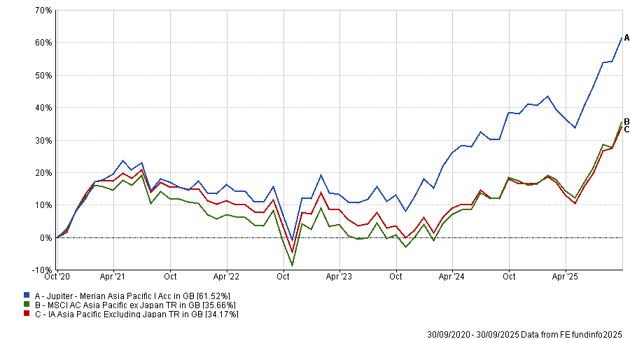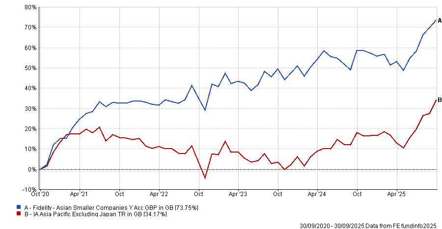 The Fidelity Asian Smaller Companies fund, led by Nitin Bajaj and Ajinkya Dhavale, took the crown for performance. Over the past five years, it has surged 73.8%, the fifth-best return in the IA Asia Pacific excluding Japan peer group, despite a 1.08% charge.