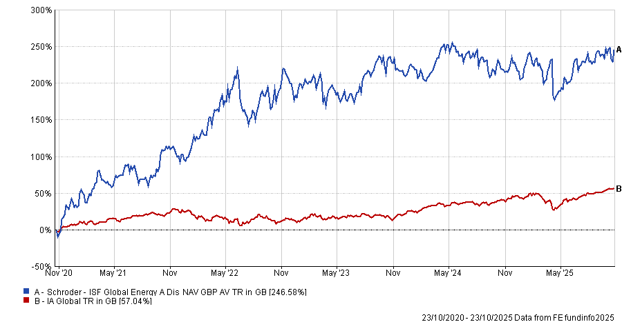 At 251.9%, the best five-year returns in the sector were delivered by Schroder ISF Global Energy, which also managed an information ratio score of 0.5.