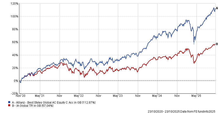 In contrast, Allianz Best Styles Global AC Equity was the least volatile of the seven funds at 11%, with an information ratio score of 0.5 and a five-year gain of 112.9%.