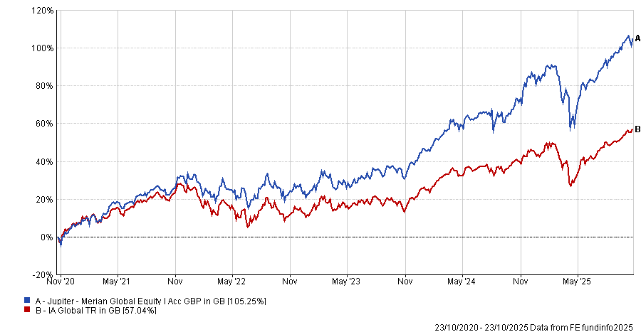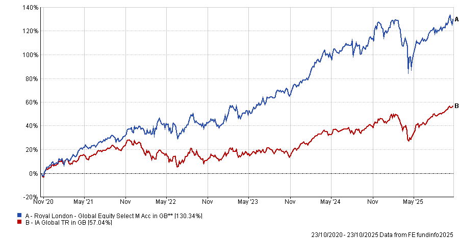 With the joint highest information ratio score of 0.7, Royal London Global Equity Select also managed a total return of 130.1% over five years, with top holdings including notable US mega-cap tech names, such as Amazon, Nvidia and Microsoft.