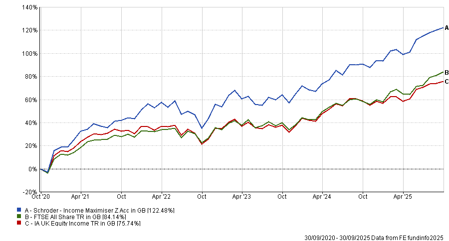 Topping the chart is the £881m Schroder Income Maximiser fund, which paired a yield of 6.9% with a total return of 122.5%, the sixth-best in the IA UK Equity Income sector.
