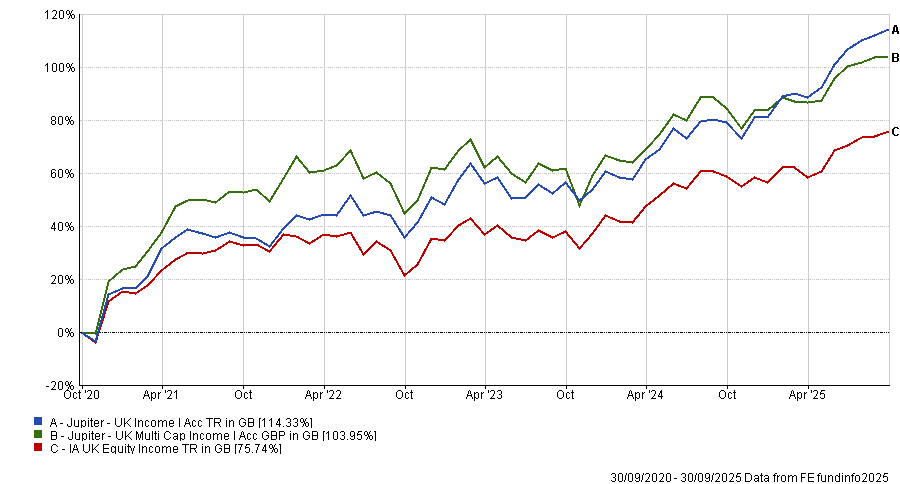 Gosden and Morrison’s other fund, Jupiter UK Multi-Cap Income, completed the chart with a 5.22% payout and a 104% five-year return.