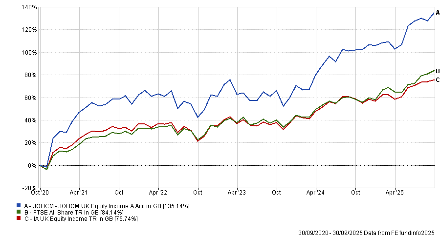 Clive Beagles and James Lowen’s JOHCM UK Equity Income fund has delivered the third-best performance in the IA UK Equity Income sector over the past five years and a yield of 4.9%.
